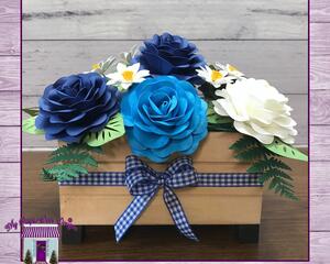 Blue & White Roses Paper Flower Arrangement In A Wooden Crate...