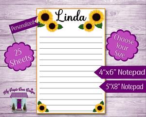 Personalized Sunflowers Lined Notepad, Memo Pad, 25 Sheets, C...